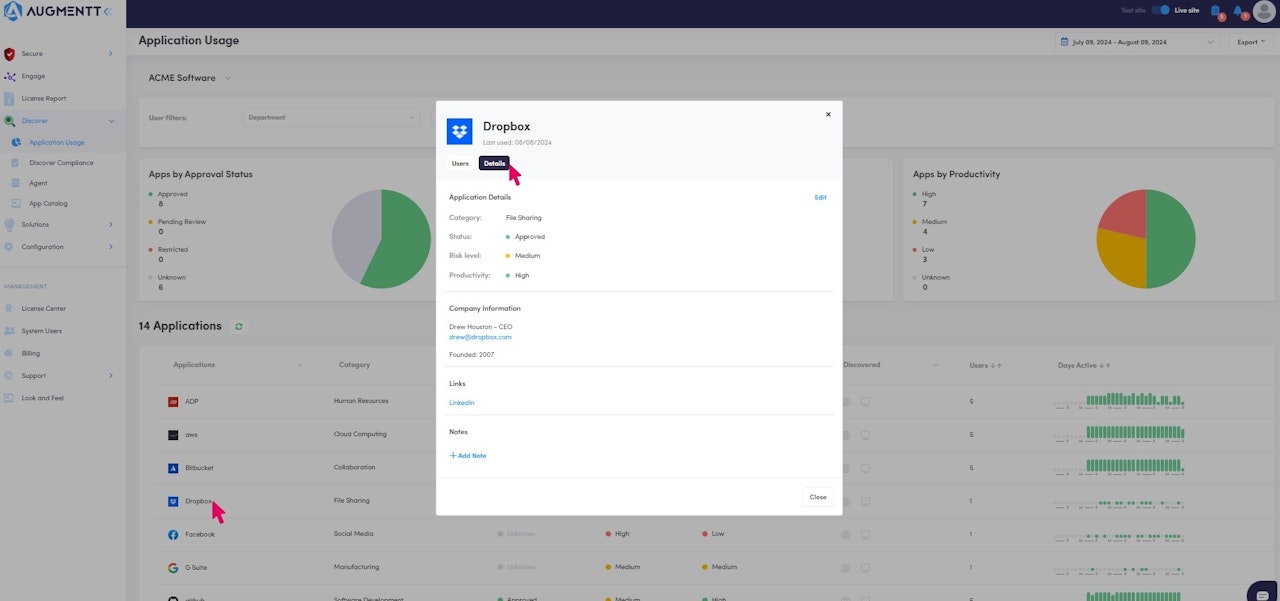 Monitoring and analyzing how various applications are used within an organization is essential for Shadow IT. The Application Usage provides insights into how applications are being used within an organization. This feature enables MSPs to: