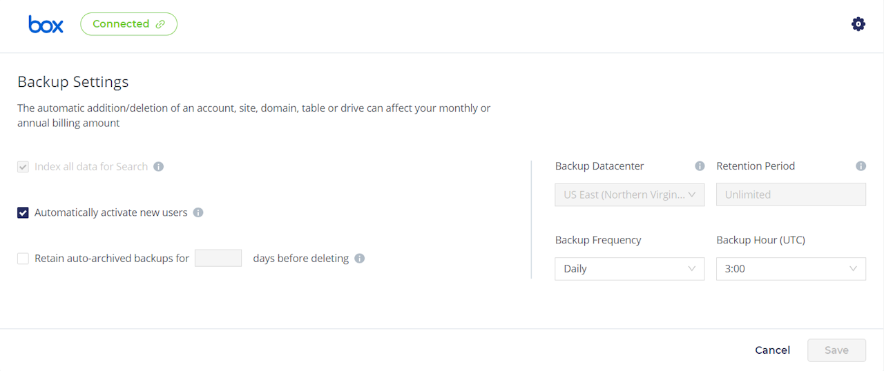 On this page, you can adjust the backup settings and activate backups for the Box users.