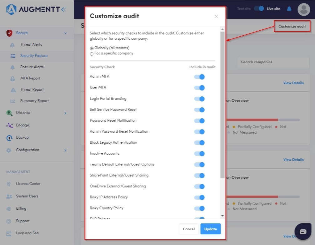 With Augmentt’s posture audit customization, globally configure your baseline best practices, while performing company-level exceptions, for consistency and ease of management. You can also apply changes to specific tenants.