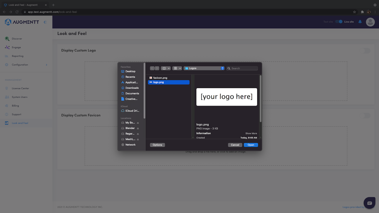 Select your company logo and favicon to replace the Augmentt branding