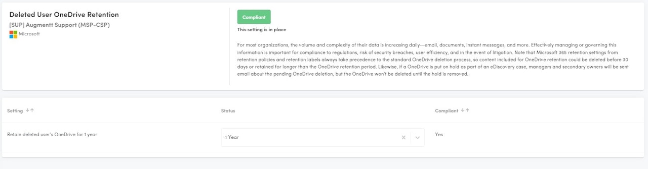 Description: This check verifies that Deleted User's OneDrive Retention settings are extended to 1 year.