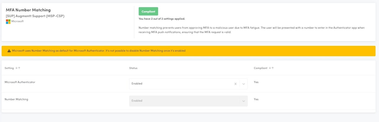 Description: This check verifies that MFA Number Matching is enabled. This requires the Microsoft Authenticator app to be enabled/used.