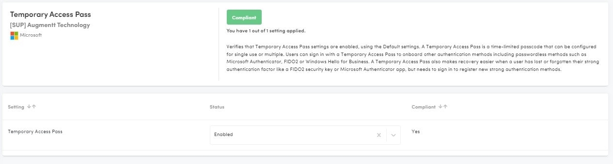 Description: This posture check verifies that Temporary Access Pass settings are enabled, using the Default settings.