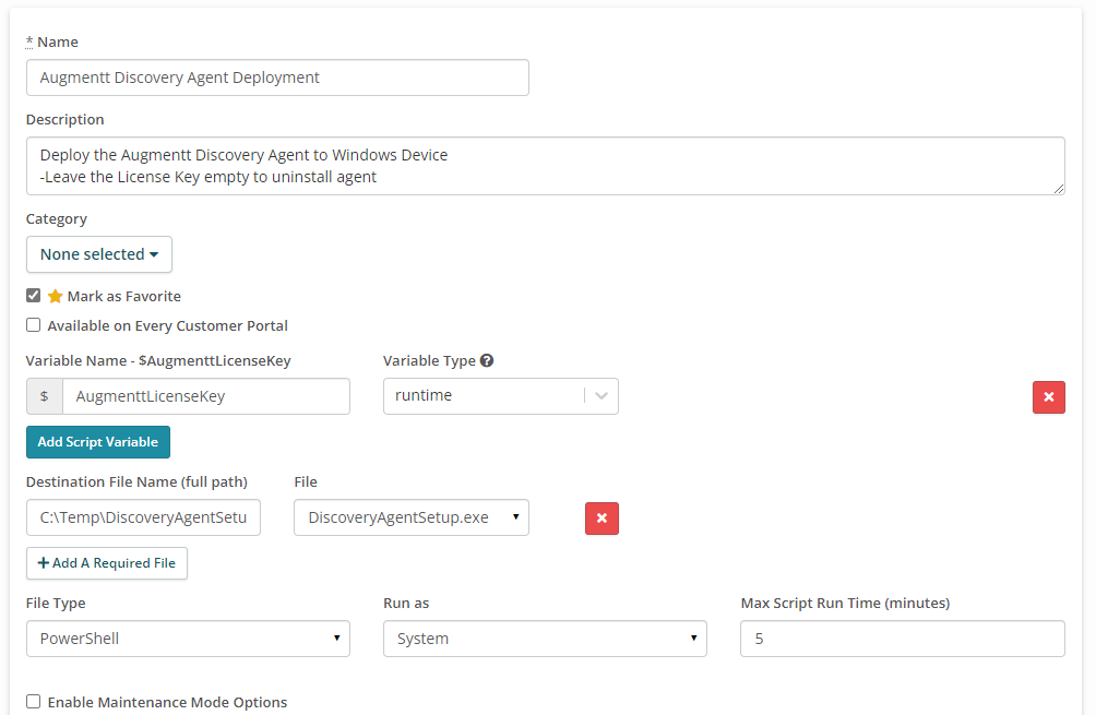 Enter the details as per the screenshot below. Note: The script we provide has an uninstall switch if you leave the License Key variable empty. You may choose to modify this. As such, update your Description accordingly as a reminder for yourself and other users.